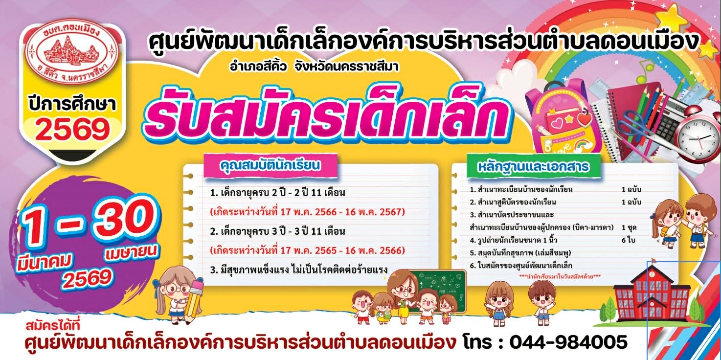 📢ศูนย์พัฒนาเด็กเล็กองค์การบริหารส่วนตำบลดอนเมือง เปิดรับสมัครนักเรียนใหม่ ปีการศึกษา 2569 👦👧รับสมัครเด็กอายุครบ 2 ปี - 3 ปี 11 เดือน (เกิดระหว่างวันที่ 17 พฤษภาคม 2565 - 16 พฤษภาคม 2567) 📅สมัครได้ตั้งแต่วันที่ 1 มีนาคม - |