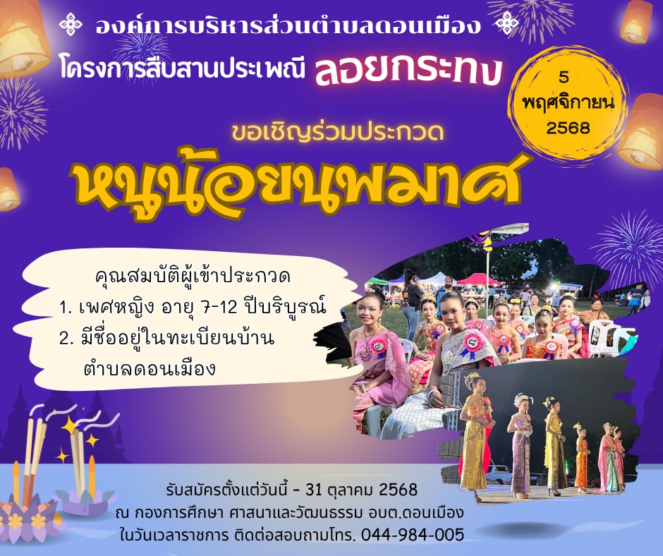 ประชาสัมพันธ์ องค์การบริหารส่วนตำบลดอนเมือง กำหนดจัดโครงการสืบสานประเพณีลอยกระทง ประจำปีงบประมาณ 2569 ในวันพุธที่ 5 พฤศจิกายน 2568 ณ สนามกีฬาโรงเรียนนาหว้าไตรประชาคม จึงขอเชิญน้องๆหนูๆร่วมประกวดหนูน้อยนพมาศ เพศหญิง อายุตั้งแต่ 7-12 ปีบริบูรณ์ ท่านใดที่สนใ |