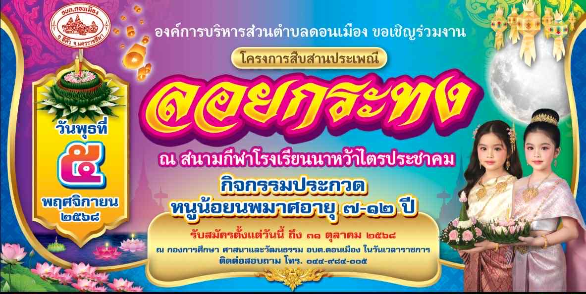 ประชาสัมพันธ์ องค์การบริหารส่วนตำบลดอนเมือง กำหนดจัดโครงการสืบสานประเพณีลอยกระทง ประจำปีงบประมาณ 2569 ในวันพุธที่ 5 พฤศจิกายน 2568 ณ สนามกีฬาโรงเรียนนาหว้าไตรประชาคม จึงขอเชิญน้องๆหนูๆร่วมประกวดหนูน้อยนพมาศ เพศหญิง อายุตั้งแต่ 7-12 ปีบริบูรณ์ ท่านใดที่สนใ |